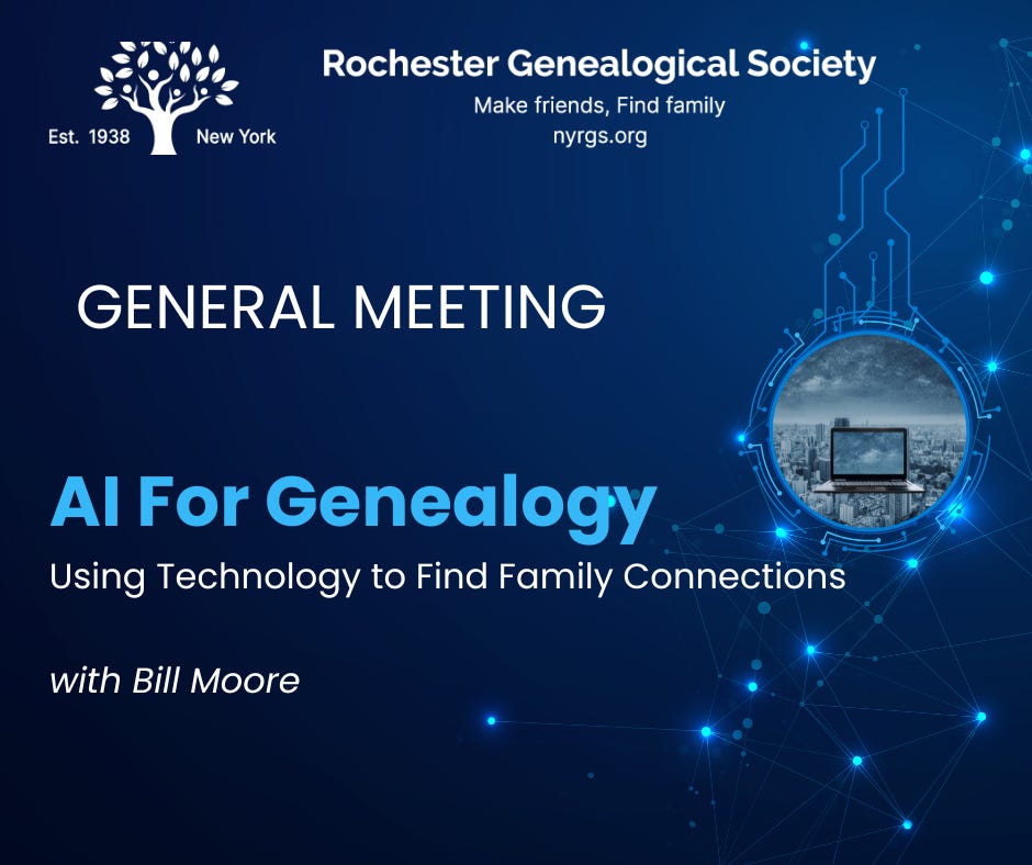 We had a fun time with the topic. I offered my experiences using AI and gave a few suggestions for best practices. I ended my presentation with an example of some of the things we can do with our genealogy. Randy Seaver generously agreed to allow me to present his ABC (Ancestor Biography Creation) process. It would be an understatement to say that our members were impressed with what Randy has done. I’m still hearing from members who have started their own AI experimentations.